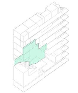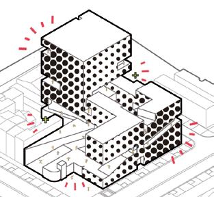 Transfer each layer’s complete circular volumes into a more fragmented one due to each programs’ need in space. Three vertical circulations are placed between the programs.