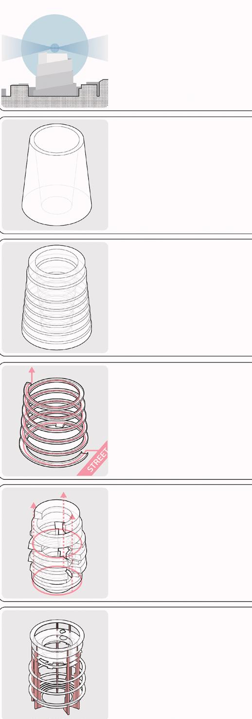 Learning from the spiral stair inside a double-shell dome, added a spiral ramp around the entire structure as public circulation, it is the extension of pedestrian street.