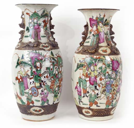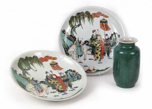 45 Pair of Chinese famille verte chargers, 19th Century, similarly decorated with figures and a traveller with elephant companion, in predominantly green enamels (one professionally restored), 38cm diameter £200 - £400 plus 25% BP*