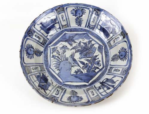 42 Chinese kraak blue and white porcelain dish, Transitional, circa 1630-50, the centre decorated with birds with informal panel borders, 31cm diameter £100 - £200 plus 25% BP*