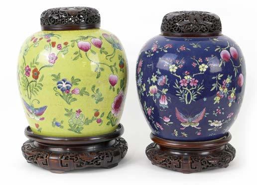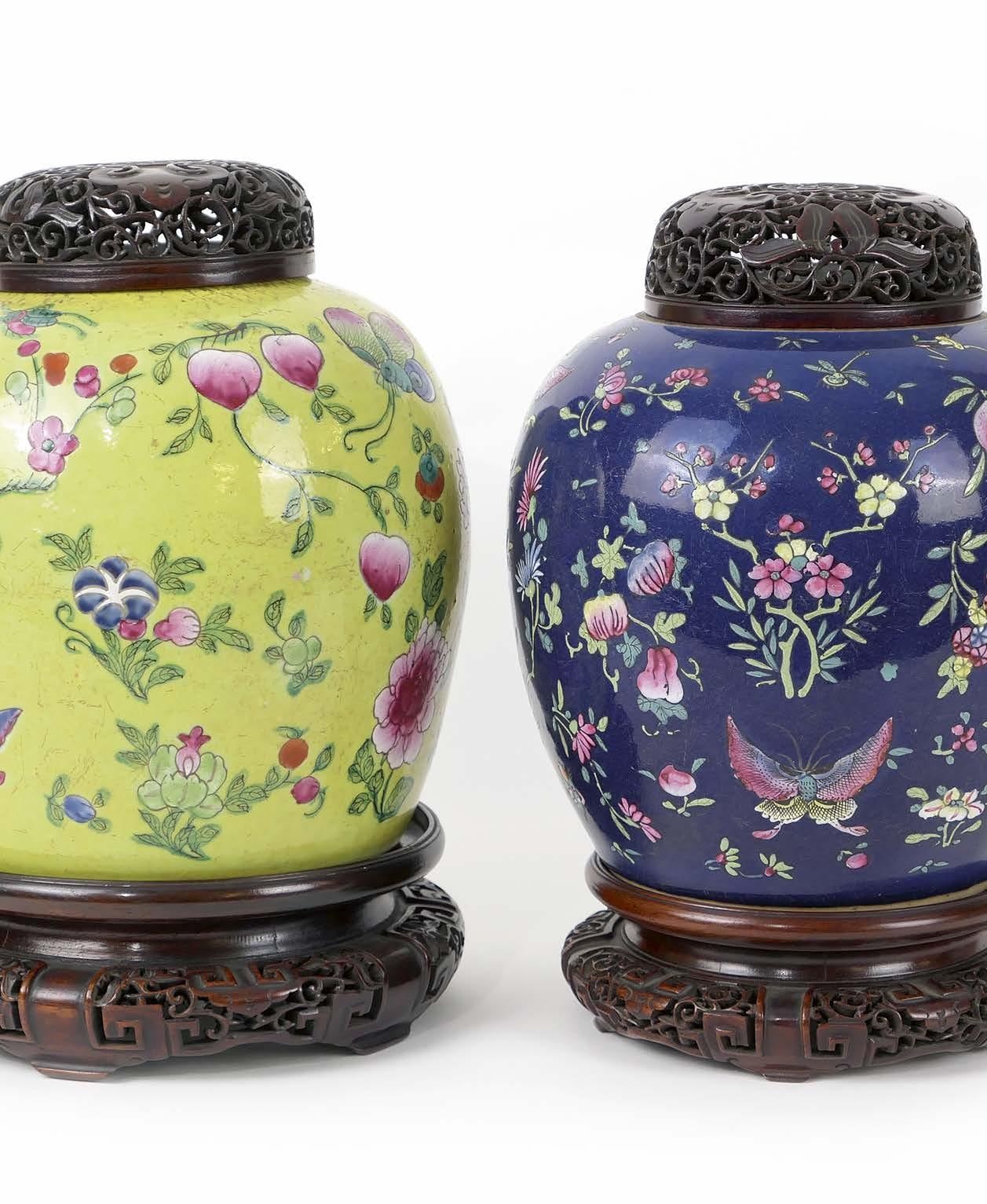 9 Two Chinese clobbered porcelain jars, 18th or 19th Century, one finished in yellow with butterflies, peaches and peony, the other in blue with similar decoration, both with pierced wooden covers and stands, overall height 31cm and 30cm respectively £300 - £500 plus 25% BP*