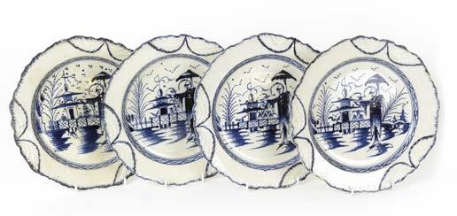 5 Three Chinese blue and white plates, late 18th Century, decorated with a pagoda landscape design with figures on a bridge, within a wavy moulded border, 24.5cm; also a Chinese blue and white saucer dish, decorated with a figure beside a peony rock, late 18th Century, 20.5cm (4) £80 - £120 plus 25% BP*