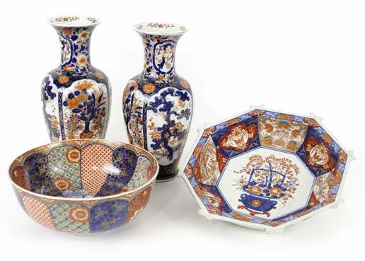 25 Japanese imari octagonal bowl, Meiji (1868-1912), centred with a basket of flowers within a decorated panelled border, 31cm; also a Japanese imari bowl, decorated with formalised panels of prunus blossom and trellis, 25cm diameter (2) £80 - £120 plus 25% BP*