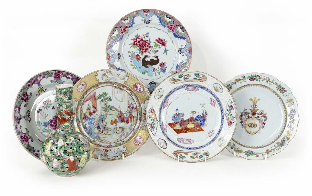 30 Five Chinese famille rose plates, all 18th Century, including an armorial plate, 22.5cm; Mandarin style gilded plate, 23cm; a plate decorated with seated figures in a sopra bianco border, 23cm diameter; and two peony patterned plates, 23.5cm and 23cm £100 - £150 plus 25% BP*