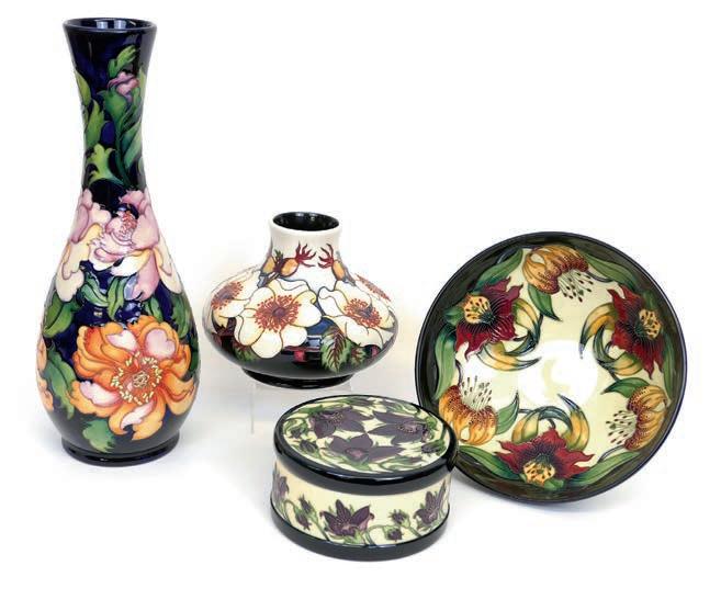 16 Moorcroft ‘Magnolia’ comport, blue ground, green mark to the base, 18cm diameter; also a Moorcroft ‘Hibiscus’ oval lidded box, blue ground, 13cm, with card box; Moorcroft ‘Coral Hibiscus’ baluster vase, green ground, green mark to the base, height 19cm; and a Moorcroft ‘Coral Hibiscus’ oval dish, green ground, length 23cm (4)