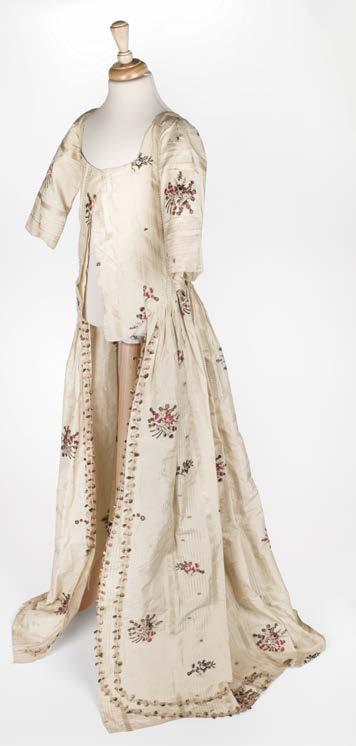 271* Clothing. A Spitalfields silk overdress, circa 1780s, hand-sewn gown of cream figured silk, with all-over self pattern of narrow vertical stripes between wide bands of sinuous foliage stems, with scattered flower bouquets and floral sprigs woven in pink, green, purple, blue, cream, and black, fitted bodice, with waist curved at the front and v-shaped to vertically tucked back, low cut neckline, elbow-length slim sleeves with small cuff, bodice and sleeves lined with linen, close-gathered skirt, pocket slits to both sides (one with horizontal tear at foot), front of skirt edged with a double border of pink, green, and cream fly fringe (missing or detached in places), some scattered marks and small holes (and a 4 x 9 cm burn hole to back of skirt towards hem), silk perishing to right shoulder and underarm, a few small grey ink or paint marks to left shoulder, seams becoming unstitched in places, bust 73.5 cm (29 ins), waist 64 cm (25 ins), sleeves 32 cm (12.5 ins), length 138 cm (54.25 ins)