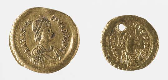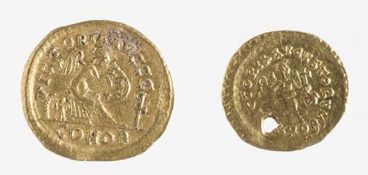 507* Byzantine gold coin. Byzantine Empire, Anastasius gold coin, Constantinople Mint c.491-518AD, obverse, DN ANASTASIVS PP AVG, depicting the emperor in profile, on the other side the goddess of victory Victoria writing on a shield, on the right a staurogram, 2.2g plus 1 other similar gold coin, 1.4g (2)
