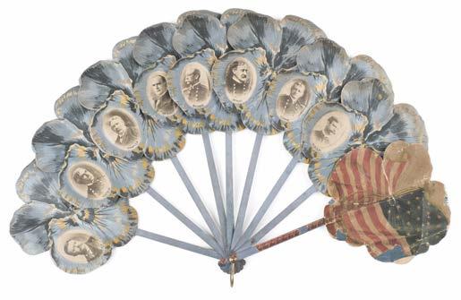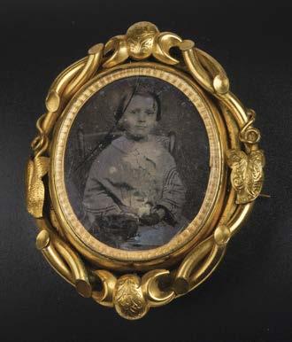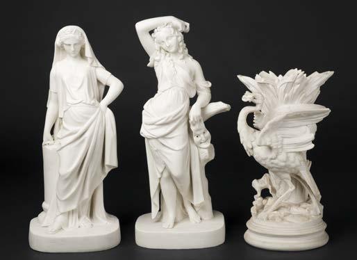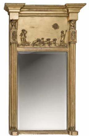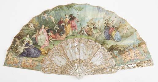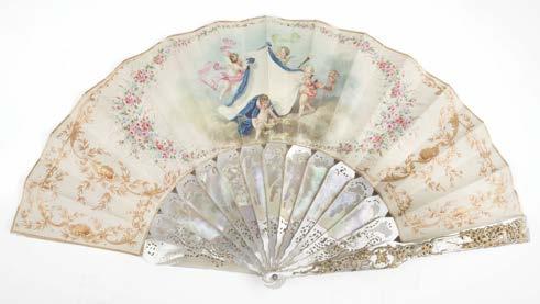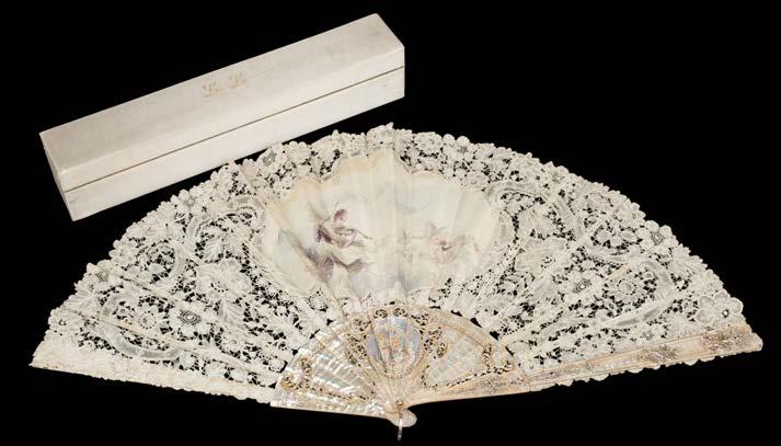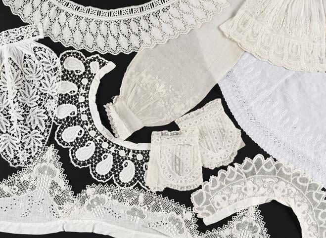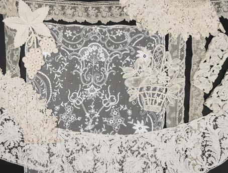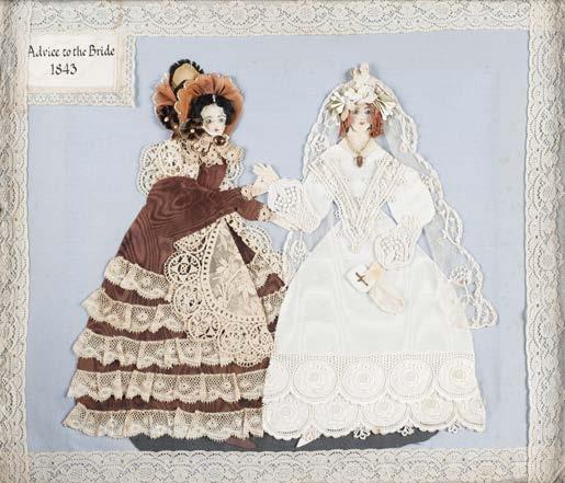272* Collage Picture. Advice to the Bride, 1843, depicting 2 standing female figures composed of a variety of materials laid onto a blue cotton background, including moiré silk, lace, wool, feathers, velvet, felt, etc., with painted facial features, the bride on the right, wearing a white gown with headdress and veil over her ringletted hair, holding a Bible in her left hand, and wearing pearly earrings and a heart-shaped locket on a chain around her neck, her mother on the left, attired in a crinoline gown, a flower and feather-trimmed bonnet on her head, and a jewel at her neck, some toning to lace, background foxed, contemporary calligraphic label in black ink to upper left ‘Advice to the Bride 1843’, stained and slightly rubbed, lace border (incorporating label), 39 x 45.5 cm (15.5 x 18 ins), gilt moulded framed repainted and with losses, glazed (47 x 53.5 cm)