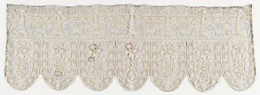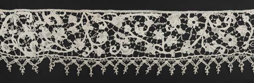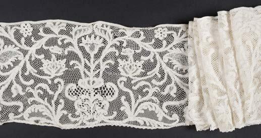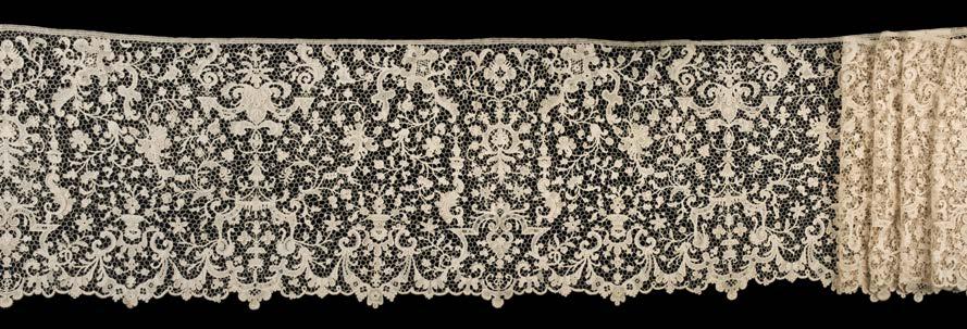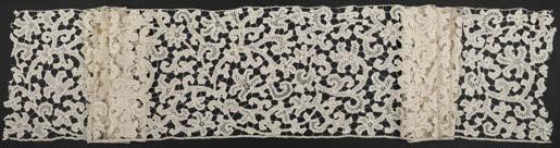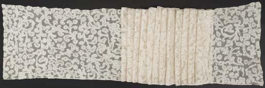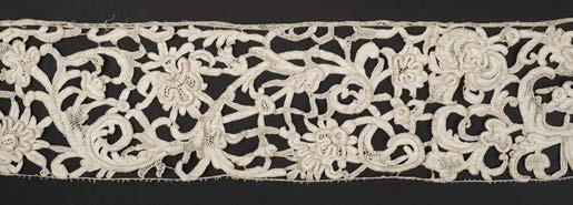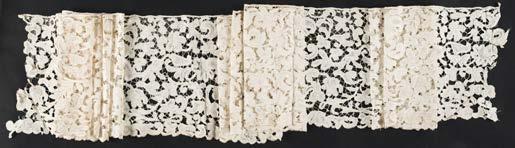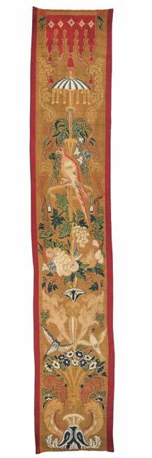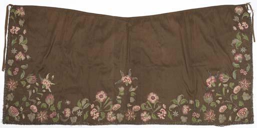 275* Embroidered Apron. A silk apron appliquéd with embroidered slips, circa 1720, apron of brown silk, with wide border to sides and lower edge composed of slips in the form of flowers and leaves, including carnations and roses, hand-worked in silks in shades of pink, green, blue, and cream, and metallised threads, using long and short stitch, couching, and satin stitch, the slips outlined and joined with couched metallised stems to form a sinuous design, 2 slips missing, one near-detached (holding by a thread), stitched trefoil border of couched metallised threads, drawstring top edge with remains of narrow brown silk ribbon (top right corner with 4 cm of border torn away from apron edge (with slight loss of border), ground with a couple of tiny holes and one area 1.5 x .5 cm just beginning to fray, some loose (and occasional lost) threads, a little faint spotting in places, 41 x 95 cm (16 x 37.5 ins)