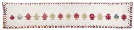 283* Embroidered Valance. A bed valance, Rhodes, Greece, 19th century, hand-stitched horizontal panel, embroidered in silk on a cream linen ground, worked in Rhodian raised stitch with 15 alternating green/blue and red large stylised vase motifs (a type of Glastra pattern?), framed in matching thread by a border of large diagonal leaves to sides and lower edge and a border of small diagonal vase motifs to upper edge, some lost stitching, hemmed to side edges, upper and lower edges raw (with red line outer border trimmed off to upper edge, and much of it lost to lower edge), a few small holes, mainly to right-hand side (largest 1.5 x 2 cm), 56 x 280 cm (22 x 110 ins)