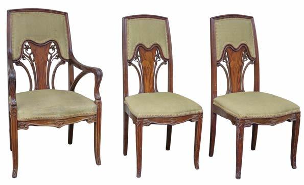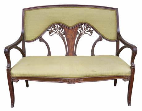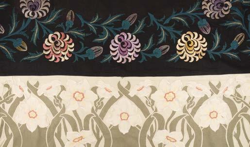 262* Art Nouveau. An appliqué panel, Continental (possibly Belgian), circa 1910, hand-stitched cream wool appliquéd design of stylised pheasant’s eye narcissi within a border, embroidered in long and short stitch and satin stitch, in wool in shades of orange, yellow, pale pink, and cream, on a green wool ground (faded), a few very small marks and holes, backed with yellow silk, top edge largely unstitched and with remains of curtain rings for hanging, 76 x 170 cm (30 x 67 ins), together with: