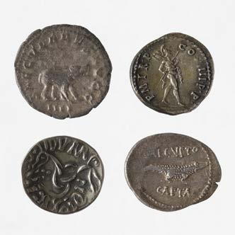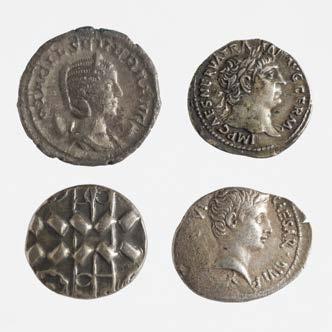526* Roman coins. Romans coins, including a Roman silver denarius coin issued by Octavian, the reverse side features a crocodile and the Latin inscription “AEGYPTO CAPTA” the obverse with a portrait of Octavian, 3.7g, a Roman bronze Otacilia Severa coin, the obverse with bust of Otacilia Severa, draped, right, the reverse SAECVLARES AVGG IIII: Hippopotamus, standing right, 4g, plus two others (4)