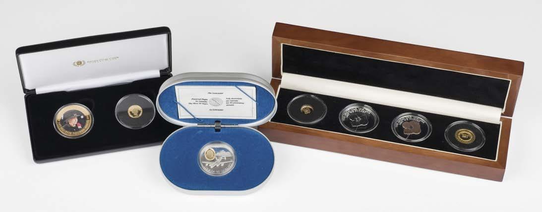 525* Proof coins. Armistice Centenary Poppy Coin Set designed by Tristan da Cunha, limited edition 51/1918, including Crown (plated), Crown (silver) and 1/4 Sovereign (22ct gold, 2g), mint in packaging with certificate of authenticity, together with The Life & Times of Her Majesty the Queen, including 9ct gold 1 crown (1g), boxed with certificate, Plus The Lancaster, Canada, 20 Dollars, boxed with certificate (3)