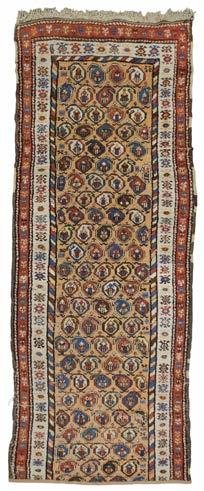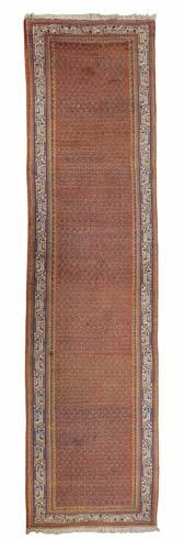 264* Carpet. An Oriental Arak woollen runner, 20th century, with a repeating blue and yellow geometric design within a multi-geometric border on a red ground, 358 x 91 cm, together with a Caucasian woollen runner, early 20th century, with a repeating Boteh design on a light red ground, within a multi-band border, 275 x 108 cm (2)