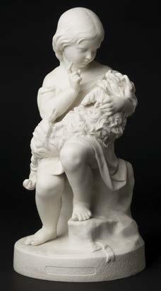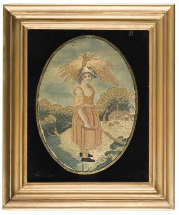282* Embroidered Pictures. A pair of oval needlework pictures of children, circa 1850, finely worked in silks, in shades of pink, green, brown, gold, and cream, using long and short stitch, french knots, and satin stitch, the face and limbs finely delineated in watercolour, on a silk ground, the latter just beginning to perish in a few small areas to sky, one depicting a young girl carrying a sheaf of wheat on her head and a forked branch in her hand, with a rustic dwelling and trees in the background, the other depicting a young girl wearing a knee-length dress, standing in a garden beside a wall with an urn atop, a classical temple to the left, each 23 x 16.5 cm (9 x 6.5 ins), verre eglomise mounts, matching gilt frames (33 x 27.5 cm), with typed note of provenance on verso