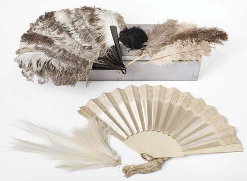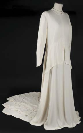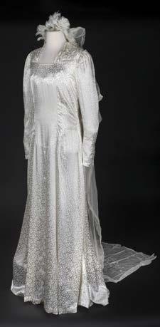 267* Clothing. A 1940s wedding dress, handmade full-length gown of ivory satin with all over leaf pattern in white, with sweetheart neckline (gathered at padded shoulders), long slim sleeves, slightly dropped fitted waist, large matching bow at rear, and slight train, opening to left side with metal poppers, covered buttons and loops to rear, slight discolouration to underarms, occasional light marks (mostly to edge of hem in places), together with the original Simplicity dress pattern for the gown, and accompanying tambour work net veil with white feather headdress attached, contained together in a cardboard box, with name and address on the lid in manuscript ‘Mrs. Joyce Lukins, 32, Roberts Rd. Madeley.’, plus: 16 other wedding dresses, early to later 20th century, all white, ivory, or cream, except one oyster pink, some with wear; 2 further white dresses; and an assortment of wedding parapernalia, including photographs, dress patterns, cake toppers, magazines, receipts, silver horseshoes, cake pillars, wedding veils, and headdresses (a number with wax flowers), some items contained in an old hat box (22)