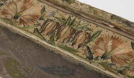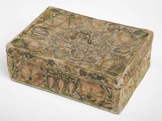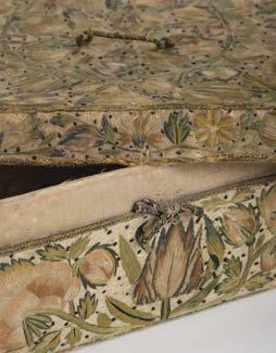 Beautifully embroidered in coloured silk and metallised threads, boxes such as these were painstakingly stitched by wealthy, often aristocratic, young ladies, often as a culmination of their needlework education. Only the upper echelons of society would have had the time and means to indulge in making such a luxury item, or indeed would have owned the personal objectsletters, sewing accountrements, cosmetics, jewellery, etc. - which might have been kept in such a receptacle. The flowers depicted are largely typical of the period, tulips particularly featuring on 17th century embroideries following the introduction of the flower to England in the late 16th century and the resulting ‘tulipmania’. More unusual, however, is the depiction of the crown imperial. It was introduced to Britain around the same time as the tulip, and although it didn’t generate quite the same response, it was considered an aristocrat amongst bulbs, and was highly valued for its dramatic, 4-foot tall, orange or yellow, bell-shaped flowers. By including it here the maker of the box may well have been making a statement regarding the exotic flowers found in her own garden.