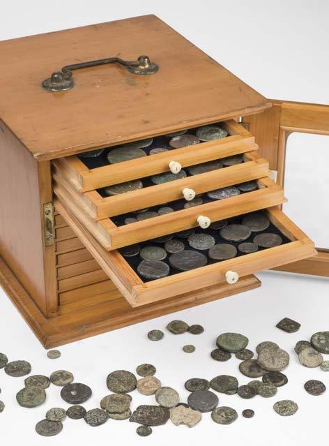 513* Coins. A mixed collection of Roman coins and tokens, AE Asses and other Denominations of various Emperors, including Antoninus Pius, Vespasian, Hadrian, some with green or brown patina, some with verdigris, found at Knossos, varying conditions, contained in a small wooden display cabinet, by Watkins & Doncaster cabinet manufacturers, London, 19 cm x 22 cm x 23cm (1)