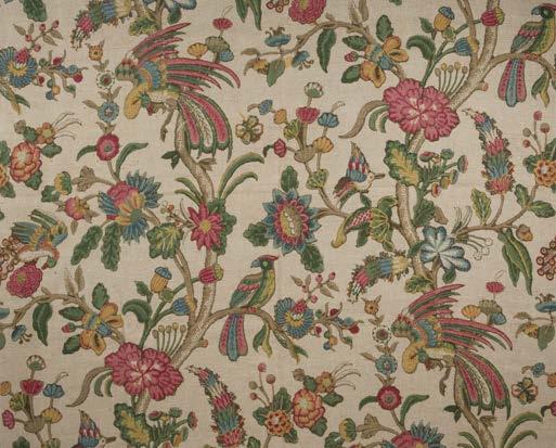 287* Fabric. A large unused length of ‘Tree of Life’ blocked linen, circa 1920s/30s, blocked in vivid polychrome colours (predominantly pink, blue, green, yellow, and brown), with a bold repeating pattern of scrolling flowers and leaves, incorporating parrots and other exotic birds at intervals, selvedges to sides, top and bottom ends raw, 247 x 131.5 cm (97 x 51.5 ins)