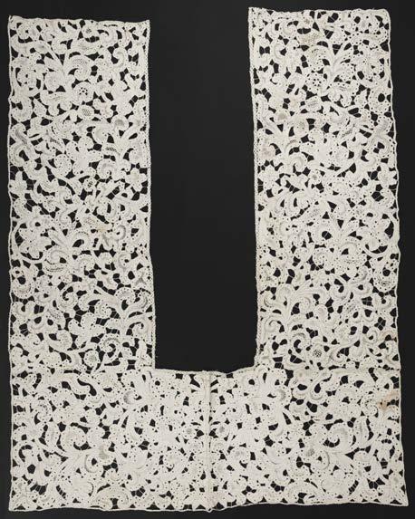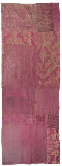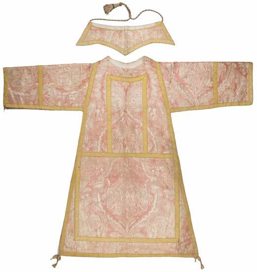 274* Ecclesiastical. A priest’s dalmatic and colletin belonging to Sir Francis Stronge (1856-1924), Mexico, probably 18th century, matching robe and collar of silver and peach brocade (faded and perishing in places, with some stitched consolidation), edged with yellow braid, lined with pale pink glazed linen, robe with matching tassels to 4 corners of hem (worn with some loss), collar with (later?) cord terminating in a tassel, lining of collar with ink stamp of the church of Santa Cruz y Soledad, Mexico, and stitched manuscript paper inventory label ‘F No 31. Sir F. Stronge’, dimensions of robe: sleeves 49.5 cm (19.5 ins), length 106 cm (41.75 ins), dimensions of collar: 16 x 53 cm (6.25 x 20.75 ins)
