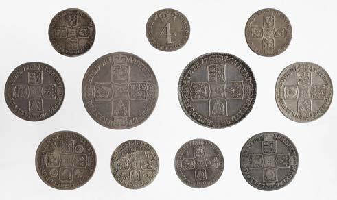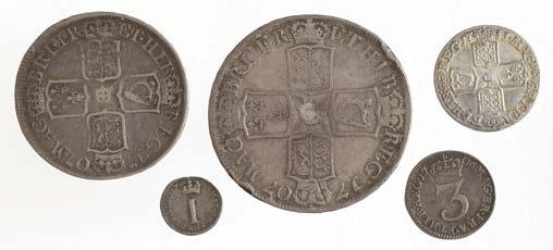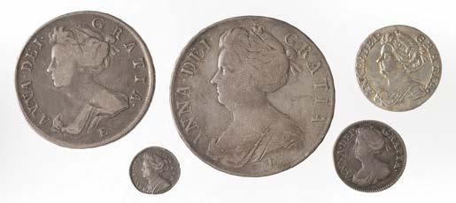 505* Anne (1702-1714). Crown, 1707, silver coin, Sexto edge, fine, together with Half Crown, 1707, fine, Sixpence, 1711, very fine, Threepence, 1706, good fine, Penny, 1703, good fine (5)