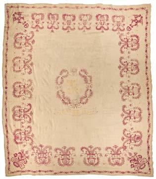 277* Embroidered Bedcover. A monogrammed embroidered coverlet, Iberian, 1857, mustard yellow wool, embroidered with lettering in yellow thread and decoration in red thread highlighted with cream thread: centre with the monogram ‘JT’ within a beribboned foliate wreath, scroll cartouche beneath with lettering ‘Ano de 1857’, wide border of large repeated flower urns, and palmette outer border, uniform loss of threadwork, some holes in ground (most repaired with green thread), originally hemmed by hand, but evidence of some later hemming both hand-stitched and machined, 239 x 204.5 cm (94 x 80.5 ins) (1)