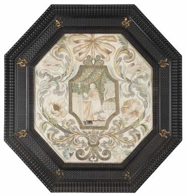 281* Embroidered Picture. A 17th century octagonal trompe-l’œil needlework, worked in silk threads in shades of orange, yellow, blue, green, and cream, incorporating metallised gold threads, on a ground of cream silk, using long and short stitch, basketweave, bullion stitch, couching, stem stitch, and french knots, the central panel simulating a portrait miniature, depicting Pope Pius V in long robes with a halo around his head, kneeling in prayer at an altar, against a fringed curtain, a balustrade and vista to his right, within a goldwork basketweave border forming a raised frame suspended by an embroidered ribbon bow, wide border of scrolling voluted stems of tulips, love-in-a-mist, columbines, anemones, and roses, the stems emanating from Pope Pius V’s papal coat of arms below portrait, featuring an oval shield with three bendlets, a triregnum (papal tiara), crossed keys, and ears of wheat, slightly faded, very occasional loss of threads, 31.5 x 29 cm (12.5 x 11.5 ins), octagonal ebonised ripple moulded frame with yellow metal ornamentation, glazed (45.5 x 43 cm), backboard with remains of an old framer’s label relaid (Andrea Bracchi, Firenze?)