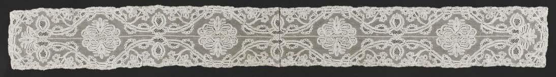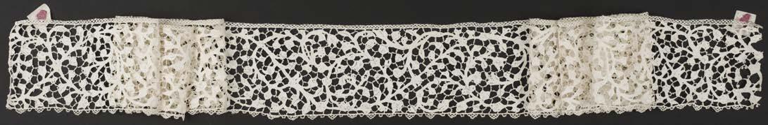 One of the labels on the verso is the transcript of an extract from the will of Eleanor Middleton Good (1864-1931), great granddaughter of Ann Middleton, leaving the item to her eldest sister (and in the event of her death, her other sisters in turn according to age). The other label offers an intriguing glimpse of the history of the item, involving a ward in Chancery, and an elopement: ‘Extract from letter from Cousin Ethel de Tall to Sarah Witty, Dec. 10, 1933 :- “Thank you for giving me the information about the brocade, of which both you & I have a panel, & I expect Una Nash (née Hawson) has a third. I always understood that Great Grandmother Middleton, née Harrison, was a ward in chancery & that the beautiful wedding dress was a gift from her guardian, who was in some way connected with the Earls of Normanby family, Mulgrave Castle. Also that in S. Kensington Museum there is a replica of the same brocade. It was from Aunt Libbie (Hawson) that I heard this.” Added by Cicely Witty :- I think Greatgreat-Grandmother Middleton was of higher social class than the groom she eloped with. So the story goes, & it sounds romantic.’