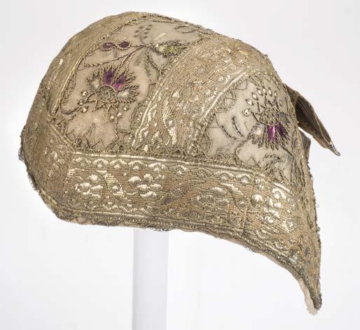 268* Clothing. A metalwork coif, German, 19th century, embroidered bonnet, hand-worked in metallised gold threads with stylised flower stems, using mainly bullion stitch and satin stitch, and incorporating spangles and coloured foil, on a cloth of gold ground, embellished with wide metalwork braid trims, later silk ribbon bow to back of bonnet, lined with brushed cream cotton (toned), 15 x 23 cm (6 x 9 ins)