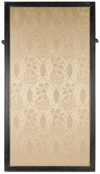 285* Fabric. A large piece of Victorian gold silk lampas, with large flower and trellis woven design, some overall spotting, selvedges to sides, 114 x 57.5 cm, (45 x 22.5 ins), glazed ebonised frame (122 x 65 cm)
