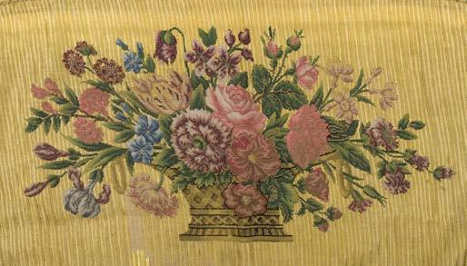 279* Embroidered Covers. Two pairs of matching needlepoint settle coverings, French, late 19th century, the design expertly worked in gros point in thick coloured silk threads, and the background worked in a herringbone stitch in canary yellow silk thread, on a canvas ground, the two larger pieces each designed for the seat of a settle, one showing a flower basket, including roses, tulips, and poppies, the other with a large pointed oval arrangement of flowers, including lilac, hydrangeas, roses, tulips, and morning glory, each with a frieze of similar flowers to side and front panels, twisted cord edging, some loss to corners where previously applied to furniture, the two smaller panels each designed for the back of a settle, each with a large oval wreath of flowers similar, some losses to yellow thread (one area sometime re-stitched), one of the back panels with stain to left-hand side, dimensions approximately 84 x 136 cm (33 x 53.5 ins) and 56 x 112 cm (23.25 x 44 ins)