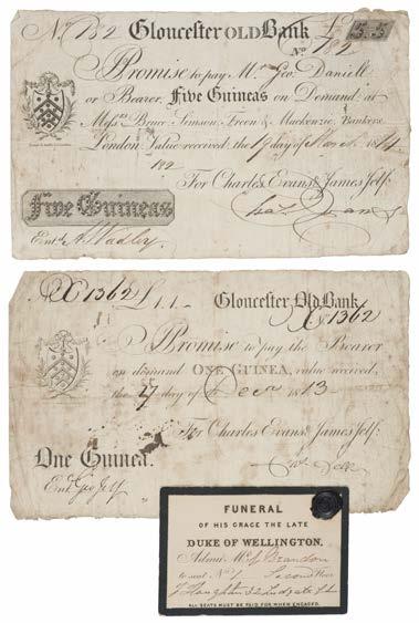 506* Banknotes. Gloucester Old Bank, for Charles Evans and Sir James Jelf, 5 Guineas, 19 March 1814, serial 182, Evans signature, embossed revenue stamp, together with Gloucester Old Bank, for Charles Evans and Sir James Jelf, 1 Guinea, 27 December 1813, serial 1362, Jelf signature, embossed with revenue stamp, both inscribed in ink verso ‘Kingshead Inn Gloucester’, plus a Duke of Wellington funeral invitation card inscribed to Mr Brandon (3) £100 - £150