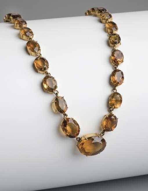 503* A yellow metal and Citrine rivière necklace, early 20th century, composed of a graduated line of oval cut citrines, each individually claw set and linked in yellow metal with a larger oval citrine at the centre, with concealed clasp and safety chain, approx 49 cm long, approximately 29.5g (1)