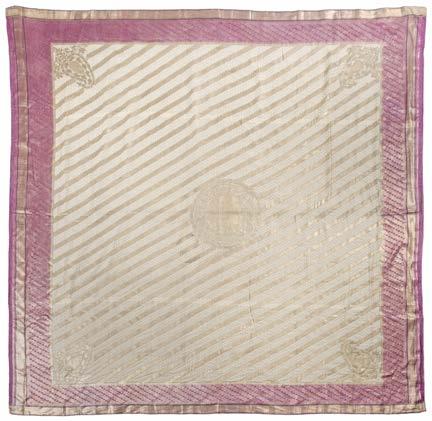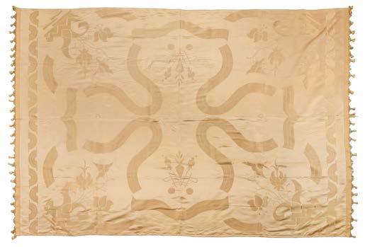 261* Art Deco. A large silk panel or coverlet, 1930s, hand-stitched figured gold silk, with large pattern of stylised flowers and other motifs, some scattered small marks, silk perishing in a number of places and expertly consolidated with unobtrusive stitching, gold tasseled fringe to short ends (some tassels missing), later orange cotton backing, 256 x 176 cm (100.75 x 69.25 ins)