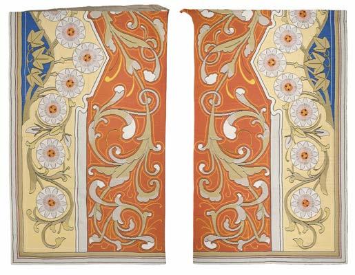 263* Art Nouveau. Needlepoint panel, French, circa 1900, large panel cut in half horizontally to form two mirror image pieces (only slight loss to pattern), handworked in gros point in coloured wools on a canvas ground, with a design of scrolling acanthus leaves to one side, with stylised passion flowers and ivy leaves to the other side, a few small marks (including 1 or 2 wax deposits), backed with brown linen, both hemmed by hand to 3 sides, remaining side to each raw where cut, length 172 cm (67.75 ins) and 178 cm (70 ins), width of each 106 cm (41.75 ins)