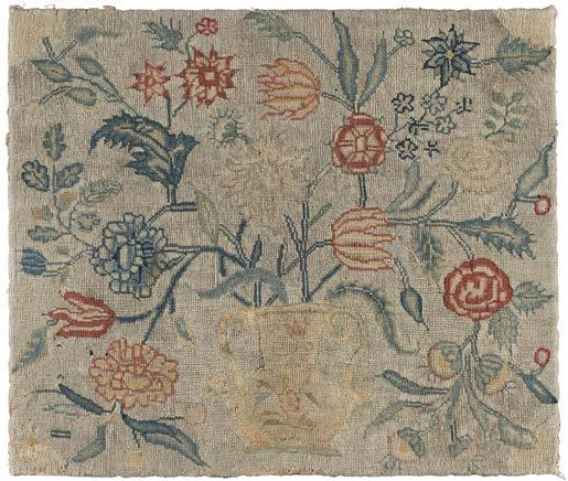 280* Embroidered Panel. A floral needlepoint panel, British, earlymid 18th century, tent stitch in coloured wools, predominantly shades of green, blue, red, and gold, depicting a two-handled urn of flower stems and foliage, including tulips, roses, acorns, and oak leaves, slightly faded, some threadbare areas (mainly to urn), and some later replacement stitches (notably to corners), sometime backed with linen and tacked to a wooden stretcher, 38 x 44.5 cm (15 x 17.5 ins)