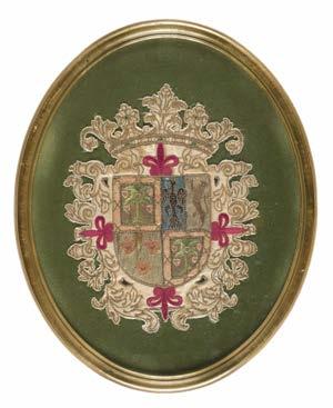 276* Embroidered Armorials. A pair of needlework armorials, French, late 17th century, a matching pair, each expertly stitched in coloured wool and metallised gold and silver threads, on a cream silk ground (a little toned, some fraying, mainly to edges), using couching, stem stitch, long and short stitch, and satin stitch, the central shield with palm trees, a black eagle, and a rampant lion, with a fleur-de-lys on each side, against a scrollwork cartouche ground, and surmounted by a crown, occasional loose or lost threads, 35.5 x 28.5 cm (14 x 11.25 ins), each stitch-mounted on green velvet, matching glazed oval gilt frames (55 x 44.5 cm), with The Rowley Gallery printed label on backboards (2)