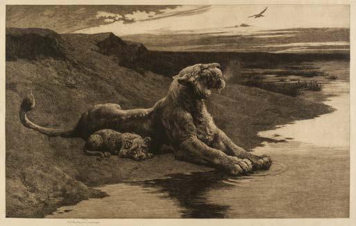 7* Barrett (Peter, 1935-). Ten original illustrations, 2007-08, 10 watercolours produced for Evolution, The Story of Life by Douglas Palmer, in assocation with The Natural History Museum, London: Mitchell Beazley, 2009, depicting various scenes including: coastal scene with birds and seals, aquatic life under the sea, mountainous landscape, lions with their kill, early humans bringing home and preparing meat, etc., all signed and dated, sheet size 26 x 62 cm (10 1/4 x 24 3/8 ins) illustrations individually framed and glazed (41 x 78.5 cm)