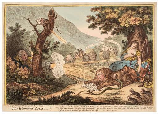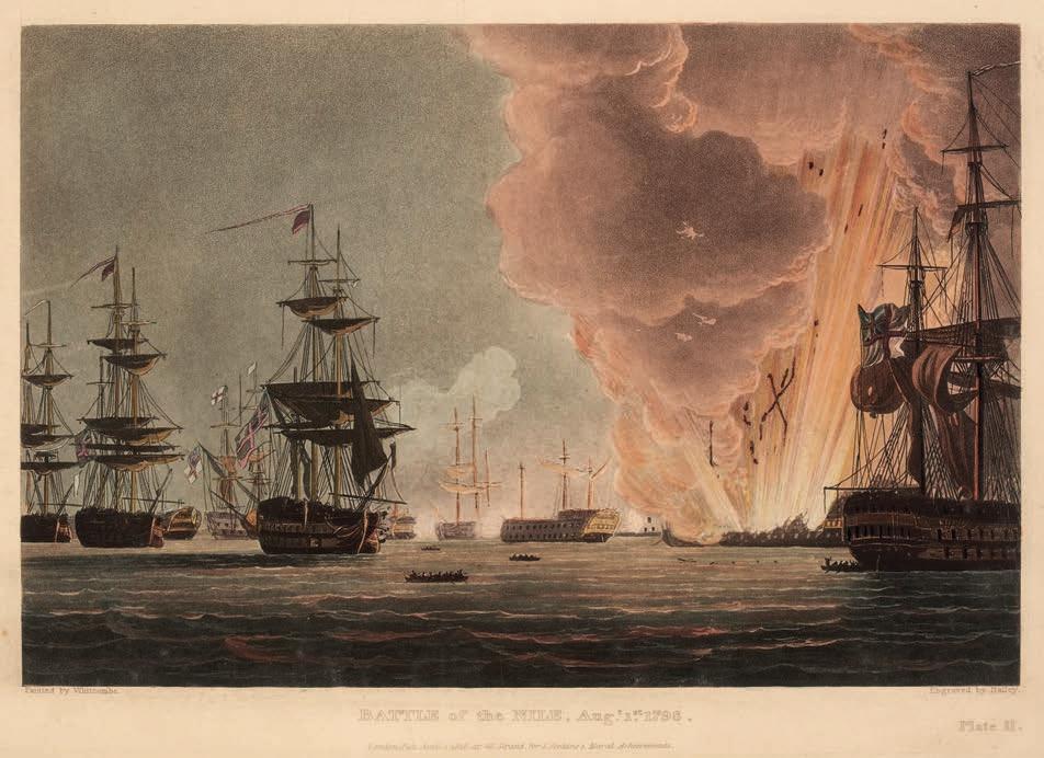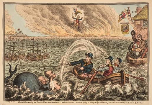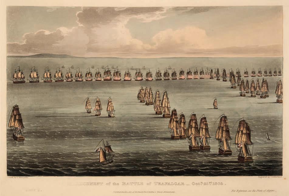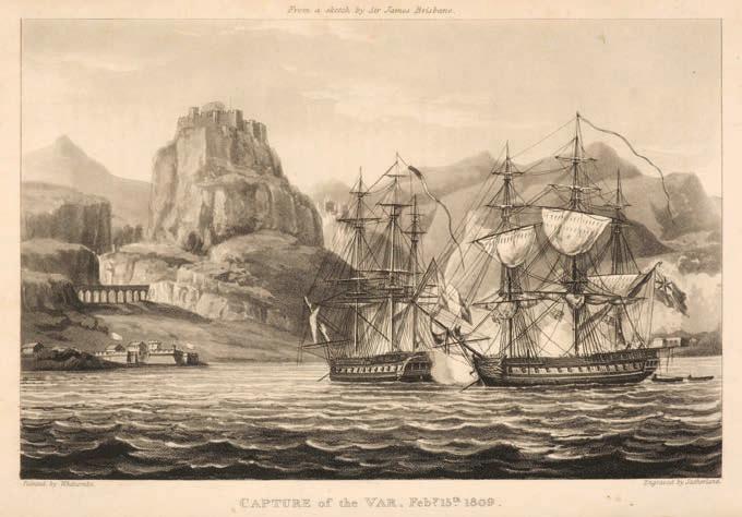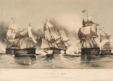 16 Jenkins (James). The Naval Achievements of Great Britain. From the Year 1793 to 1817, London: printed for J. Jenkins, by L. Harrison, [1817], engraved title with hand-coloured vignette, 55 fine hand-coloured aquatint plates by T. Sutherland and others after T. Whitcombe, one uncoloured plate, title watermarked ‘Whatman 1828’, other leaves watermarked ‘Whatman 1816’, bound without the portraits of Nelson and St. Vincent as often, a few small marginal spots and stains, top edge gilt, later handsome red half morocco, spine with raised bands lettered in one compartment, others with anchor device in gilt, 4to, 34 x 26.5 cm