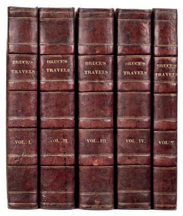 5 Bruce (James). Travels to Discover the Source of the Nile, in the Years 1768, 1769, 1770, 1771, 1772, 1773, 5 volumes, 1st edition, Edinburgh: by J. Ruthven, for G. G. J. and J. Robinson, London, 1790, half-titles to volumes 2 and 3 only, engraved vignettes to titles, 58 engraved plates, 3 folding maps (‘The Chart of Solomon’s Voyage to Tarshish’ supplied from a later edition), 4 leaves of Ethiopian dialects, armorial bookplates of William Hodgson Cadogan to front pastedowns, occasional light spotting and offsetting, titles to volumes 1 and 4 and ‘Ceraste’ plate in volume 5 repaired, early 19th-century half calf gilt, rubbed, 4to Blackmer 221; Cox I p. 388; ESTC T51608; Nissen ZBI 617; cf. Macro Arabian Peninsula 600-1 for later editions.