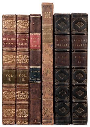 14 Holman (James). Travels through Russia, Siberia, Poland, Austria, Saxony, Prussia, Hanover, &c. &c. undertaken during the Years 1822, 1823, and 1824, while suffering from total Blindness, and comprising an account of the Author being conducted a State Prisoner from the Eastern parts of Siberia, 2 volumes, London: Geo. B. Whittaker, 1825, engraved frontispiece to each (offset to title), 8 lithograph plates, contemporary calf, gilt decorated spines with contrasting morocco labels, joints rubbed and slightly cracked, 8vo, together with: