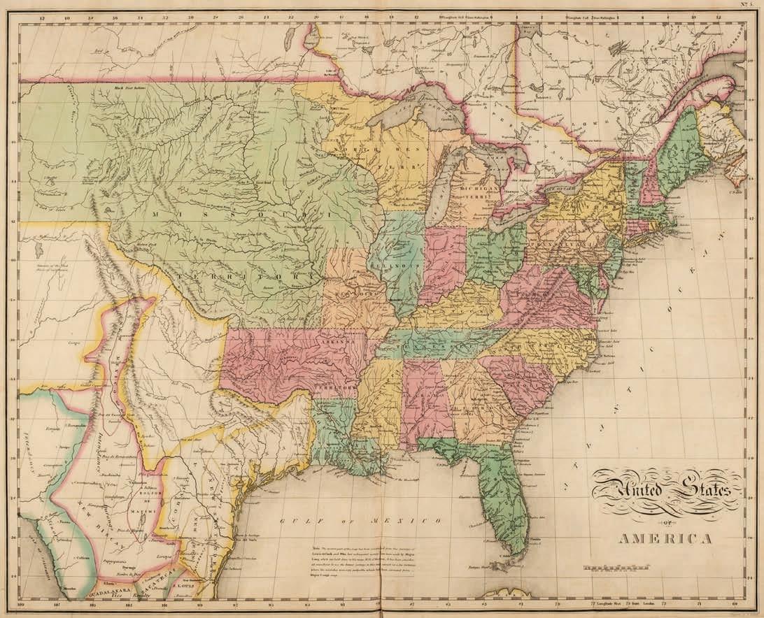 6 Carey (H. C & Lea I.). A Complete Historical, Chronological and Geographical American Atlas, being a Guide to the History of North and South America and the West Indies Exhibiting an Accurate Account of the Discovery, Settlement and progress of their various Kingdoms, States, Provinces &c. together with the Wars, Celebrated Battles and Remarkable Events to the Year 1822, 1st edition, Philadelphia, 1822, letterpress title, advertisement and contents list, the contents list with a small ink stain, 54 (complete as list) numbered double-page engraved map sheets, charts and letterpress tables, contemporary wash colouring, the appendix to the map of Hispaniola torn with a small area of loss to the lower margin, but not affecting the printed image, endpapers toned and creased, contemporary mottled calf, gilt decorated spine, bumped and rubbed at extremities, folio