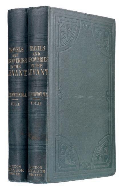 22 Newton (Charles Thomas). Travels and Discoveries in the Levant, 2 volumes, 1st edition, London: Day & Son, 1865, folding map frontispiece to each, 39 plates (including 12 lithographs, 7 folding maps and plans), some plates etched after photographs by Colnaghi and Spackman, further woodcuts in text, occasional heavy spotting and foxing, small reference numbers in pen to front pastedowns, original blindstamped green cloth gilt, minor marks, ink shelf mark numbers to spines, 8vo Atabey 869; Blackmer 1193; Gernsheim, Incunabula of British Photographic Literature, 284.