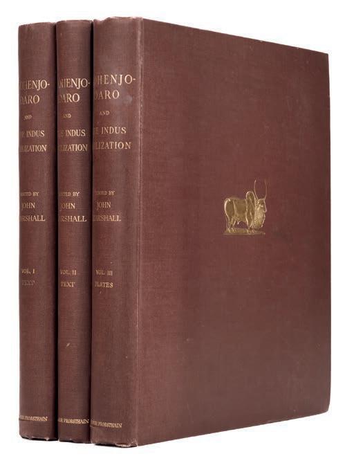 19 Marshall (John, editor). Mohenjo-Daro and The Indus Civilization, being an official account of Archaeological Excavations at Mohenjo-daro carried out by the Government of India between the years 1922 and 1927, 3 volumes, 1st edition, London: Arthur Probsthain, 1931, 164 plates (including folding plans, illustrations after photographs), 2 folding maps to rear pocket of volume 1 (plus an additional large folding map of the region from unrelated work), further smaller illustrations in-text, bookplate of W and P.J. Kupfer to front pastedowns, plate V neatly repaired to upper margin, original publisher’s pictorial brown buckram gilt, a few light marks, folio An excellent set of this pioneering work on Mohenjo-Daro (meaning ‘Valley of the Dead Men’), the largest settlement of the Indus Valley Civilisation. Located in Sindh, Pakistan, it is one of the earliest known large cities, founded in the 26th century BCE.