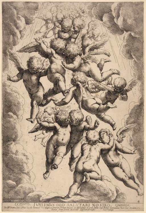 7* Reni (Guido, 1575-1642). A Glory of Angels, after Cambiaso, circa 1607, etching, a very good impression, printing with effective contrasts,t he final state, with extra heads added at the top, collector’s stamp of Martin Folkes lower right (Lugt 1033) and George Walker’s paraphe ‘G. W. Edinburgh’ in pen and ink verso (Lugt 1224), with a thread margin or trimmed to the borderline, a small skinned patch lower left verso, generally in very good, well preserved condition, 40.5 x 27.5 cm (15 7/8 x 10 3/4 ins) in a conservation mount