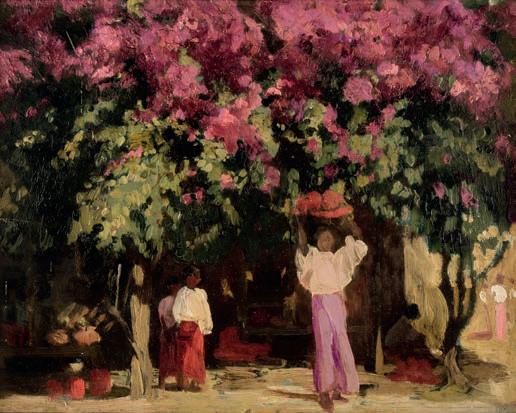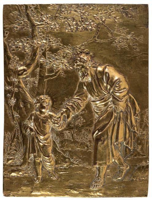 386AR* Shanahan (David, 20th/21st century). Apaches at the Seaside, oil on board, signed lower left, 75.5 x 102 cm, framed A companion painting to this worl is at Saatchi Art Gallery.389* Netherlandish School. Joseph and the Christ Child, probably 19th century, gilded bronze plaquette, after a 17th century original showing Joseph walking with the Christ Child in woodland, a city in the background, 21 x 16 cm (8 1/4 x 6 1/4 ins)