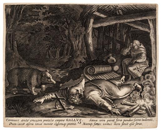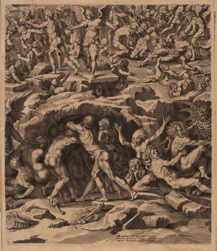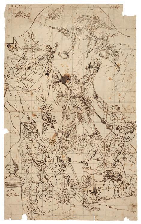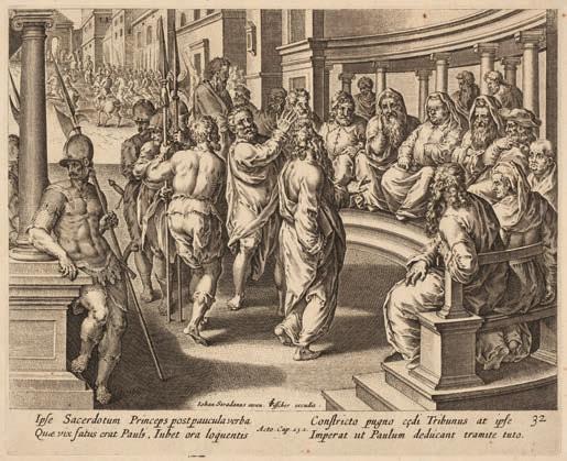 4* Straet (Jan van der, 1523-1605). The Jailer about to kill himself, converted by Saint Paul, & Saint Paul before the High Priest, plates 28 and 32 from the series Acta Apostolorum, circa 1582, engravings, very good, crisp and black impressions published by Claes Jansz. Visscher (1587-1652), on laid paper with a Fool’s Cap watermark (related to Churchill 361), plate size 21 x 25.5 cm, sheet size 28.2 x 35.8 cm, together with Goltzius (Hendrick, 15581678). The River God Peneus surrounded by other Divinities, plate 15 from Ovid’s Metamorphoses, Book I, 1589, engraving on laid paper, a very good impression of the second (final) state, with narrow margins, laid down, an engraving by Jacques Grandhomme of a decorative border representing various animals (the centre of the print removed), and others various
