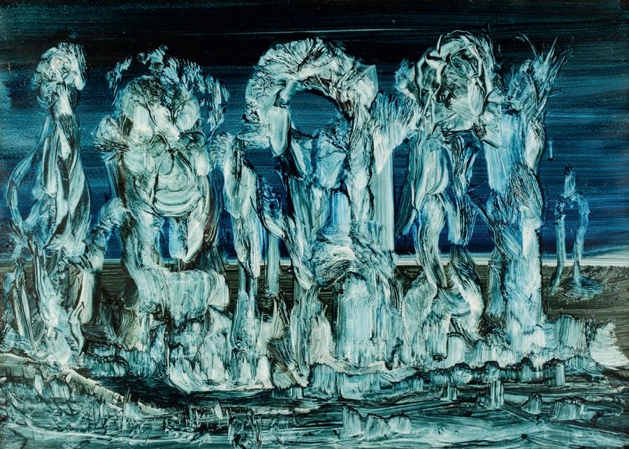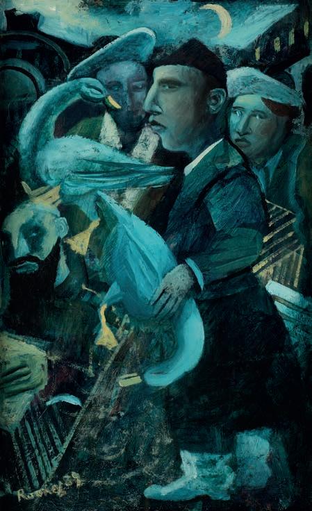 387AR* Shanahan (David, 20th century). The Four Seasons, a series of 4 paintings: The Death Song, Fading Light, Breaking the Taboo, The Spirit Guide, 2006, oil on board, signed lower left or right, The Death Song 52.5 x 75 cm, Fading Light 47.5 x 61.5 cm, Breaking the Taboo 53.5 x 7 cm, The Spirit Guide 42.5 x 53.5 cm, framed Irish-born artist David Shanahan studied at Kingston School of Art and Dartington College of Arts and his artworks have previously sold at auction and at art galleries including Saatchi Art.