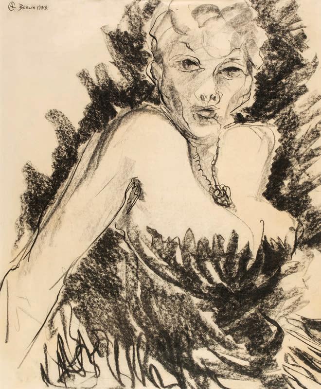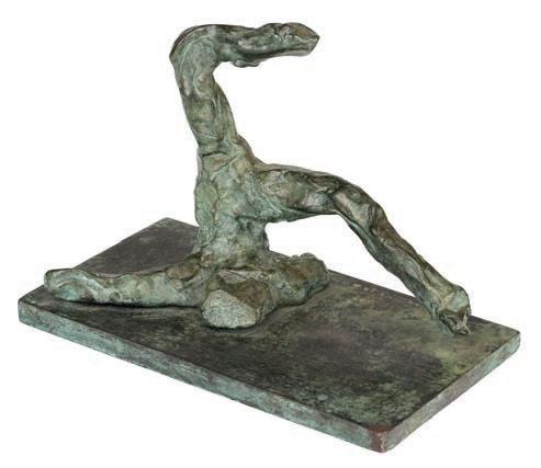 Dancer, bronze with green patina, showing a figure sitting on the floor with back arched, one hand to head, legs bent, ‘1’ in pen to underside of base, screwed onto a 19 mm high base, figure 120mm tall, overall height 139 mm This sculpture is possibly from Abrahams Trente-Six series of bronzes produced in 1989, in a limited edition of 9.