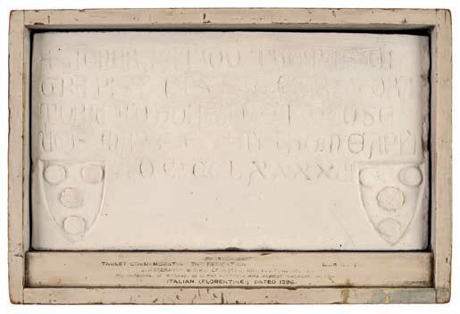 Commemoration Tablet, after a medieval Italian original dated 1296, a plaster copy after the original marble in the Victoria and Albert Museum, London, 20.5 x 37.6 cm (8 x 14 3/4 ins), in original wood frame with manuscript title to wooden baton below, remains of an original label dated 1923 to verso,(27.5 x 41 cm)